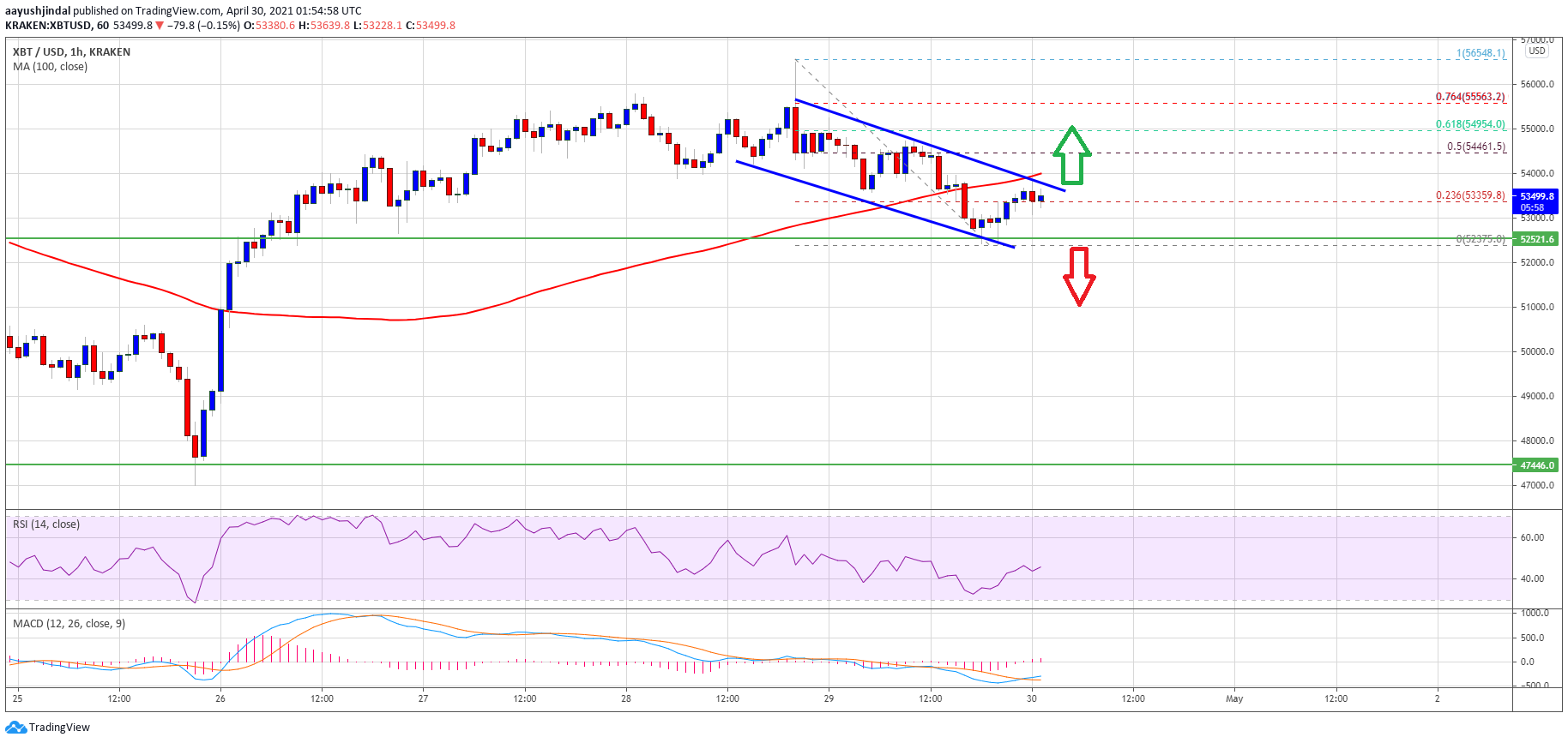 - There is a major declining channel forming with resistance near $54,000 on the hourly chart of the BTC/USD pair (data feed from Kraken).