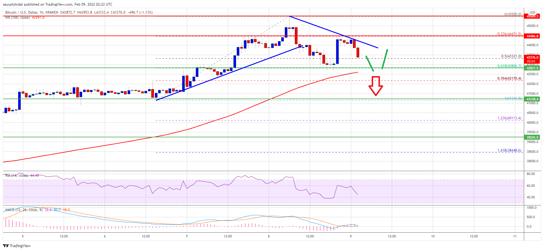 There is also a connecting bearish trend line with resistance near $44,000 on the same chart. The next major resistance is near the $44,450 zone, above which the price may perhaps start a fresh increase in the near term.