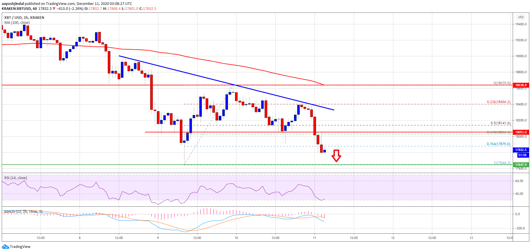 Bitcoin price is showing bearish signs below $18,050 against the US Dollar. BTC is now likely to continue lower and it could even trade below $17,500