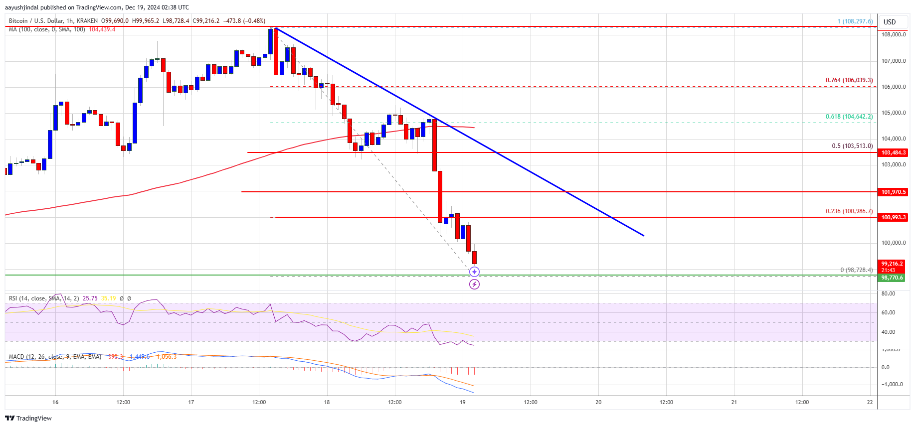 There was a clear move below the $102,500 support level. The price even dipped below $100,000. A low was formed at $98,728 and the price is now consolidating losses. There is also a connecting bearish trend line forming with resistance at $102,000 on the hourly chart of the BTC/USD pair.