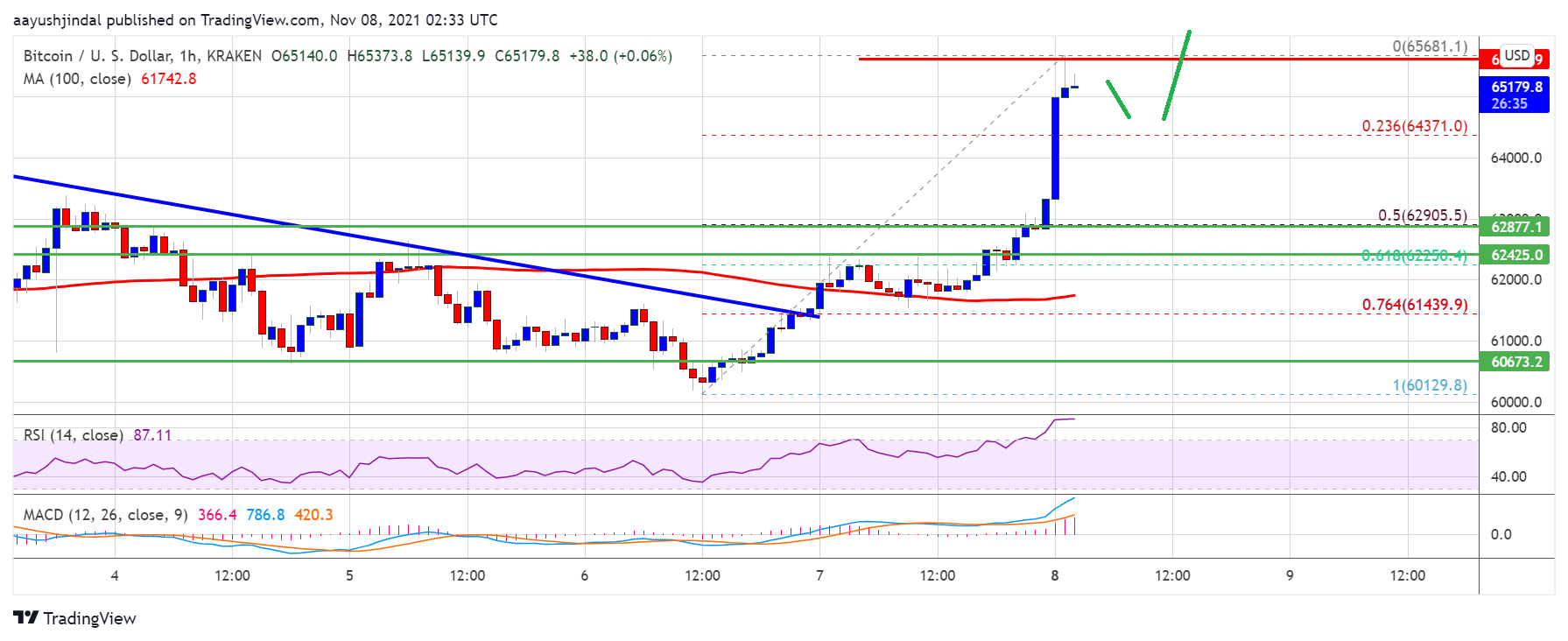 Bitcoin price started a fresh rally above $65,000 against the US Dollar. BTC is showing positive signs and it could rise further towards $70,000.