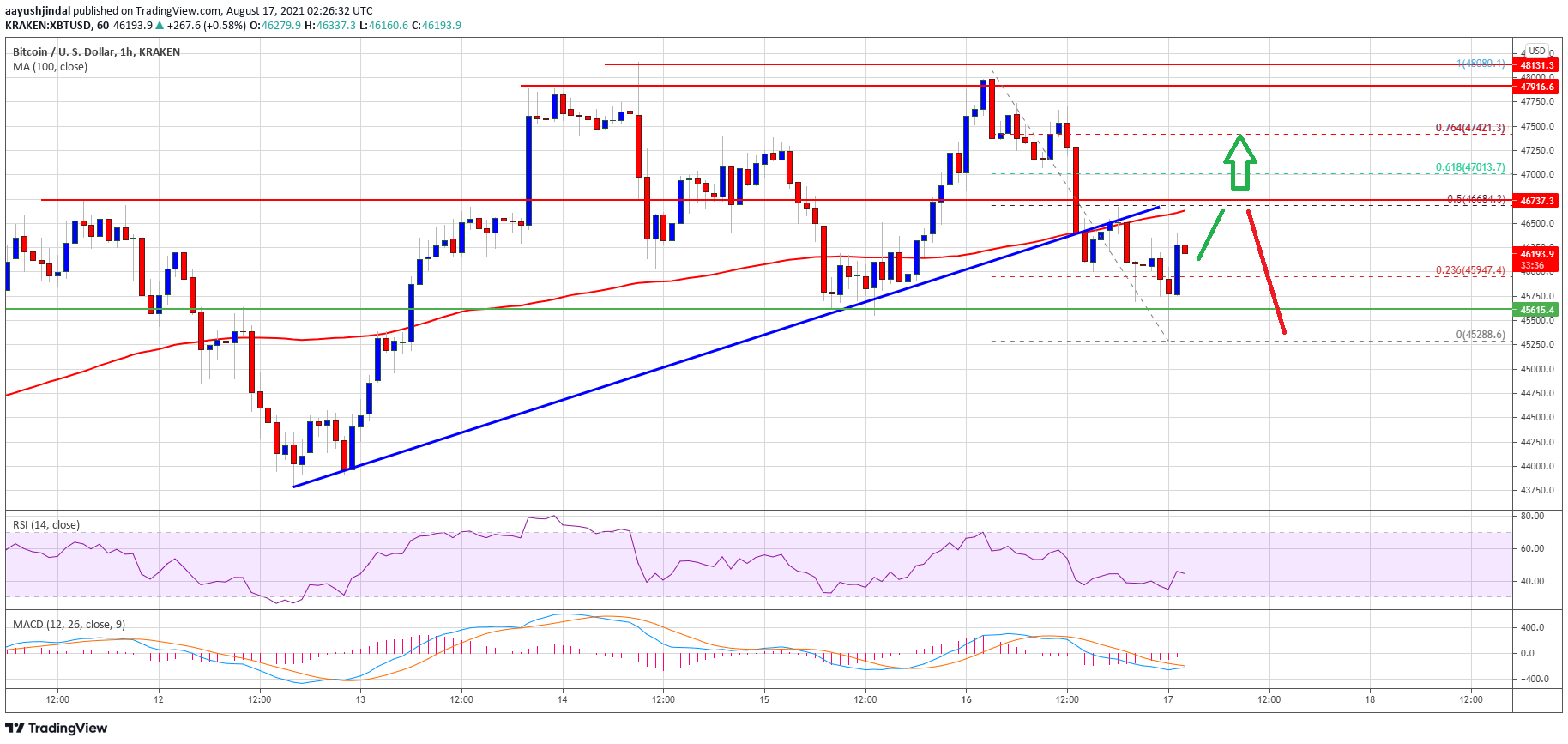 The pair spiked below the $45,500 support level, but it remained above $45,000. A low is formed near $45,288 and the price is now consolidating losses. It corrected above the $46,000 level. There was a break above the 23.6% Fib retracement level of the recent decline from the $48,080 swing high to $45,288 low.