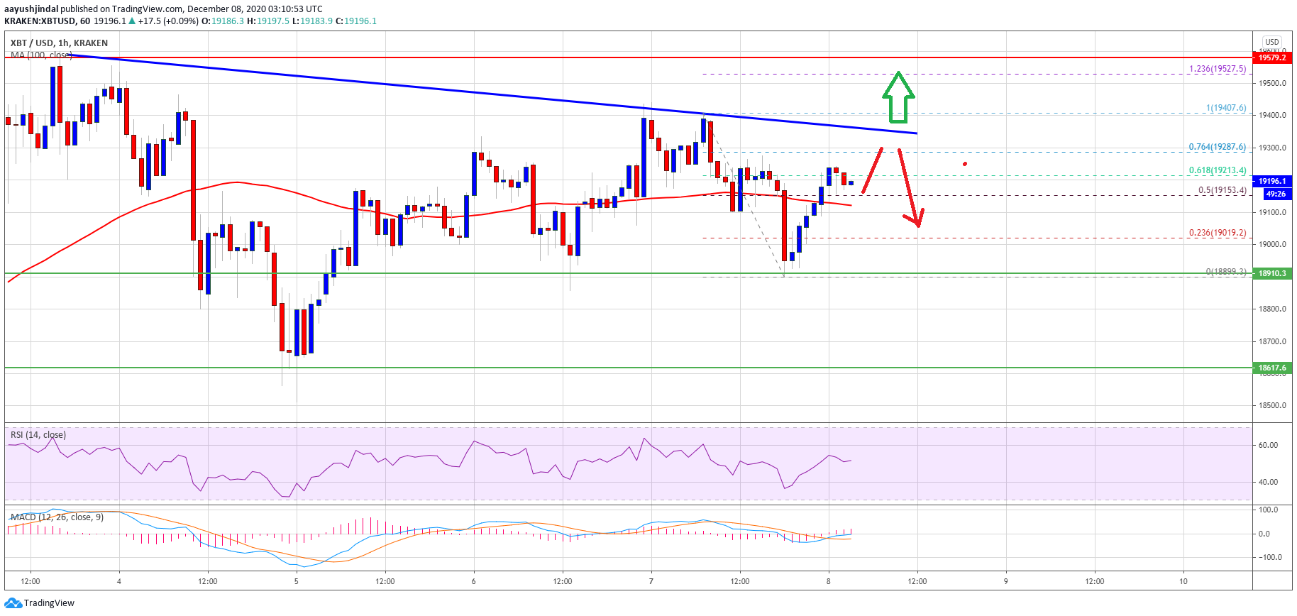 Bitcoin price is still trading in a broad range below the $19,500 resistance against the US Dollar. BTC must gain strength above $19,500 to start a fresh rally in the near term.