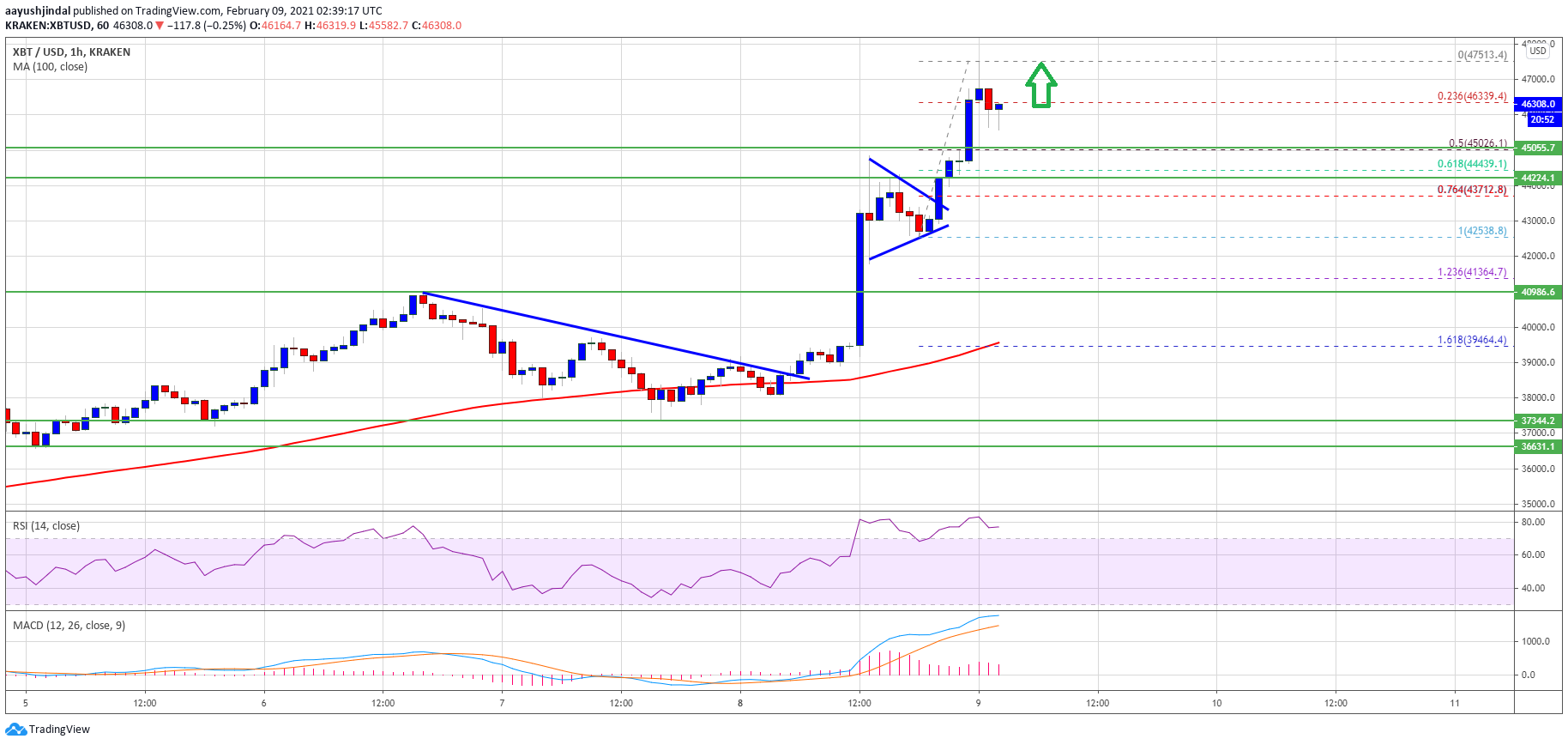 After hitting $44,500, there was a minor consolidating. Finally, there was a break above a bullish continuation pattern with resistance near $43,500 on the hourly chart of the BTC/USD pair. The pair climbed further higher above the $45,000 and $46,000 levels.