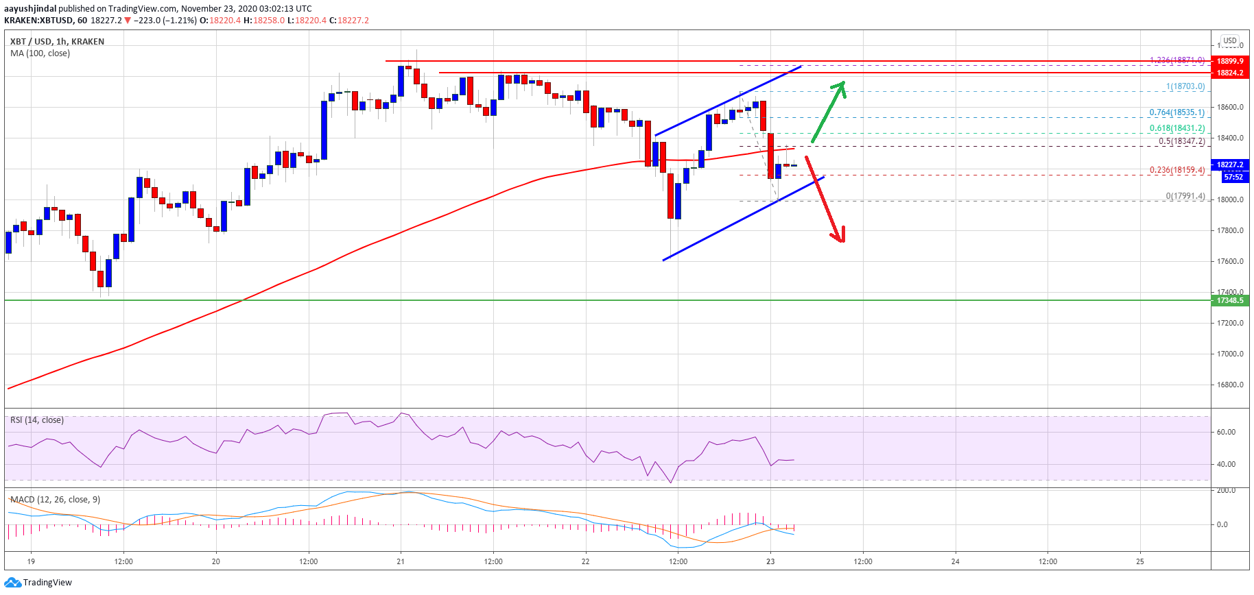 However, the price struggled to gain momentum and it seems to be facing a strong resistance near the $18,700 and $18,800 levels. The last swing high was near $18,700 before the price dived below $18,200. It traded as low as $17,991 and settled below the 100 hourly simple moving average.