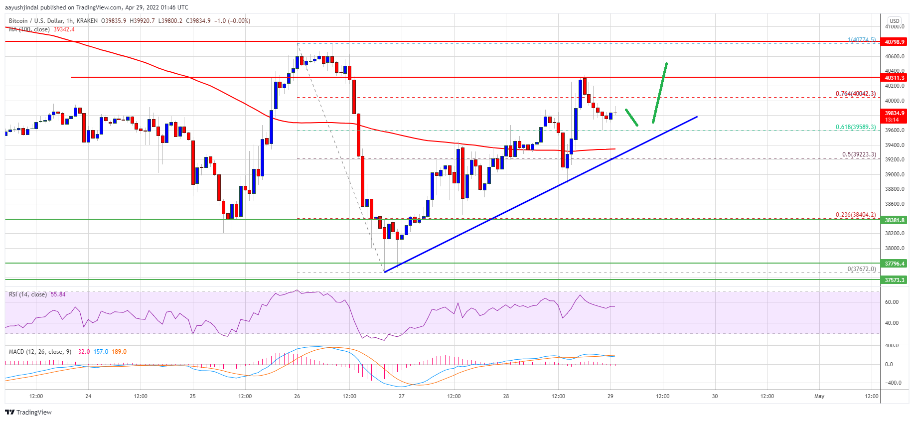 Bitcoin price is now trading above $39,500 and the 100 hourly simple moving average. It even spiked above the $40,000 resistance.