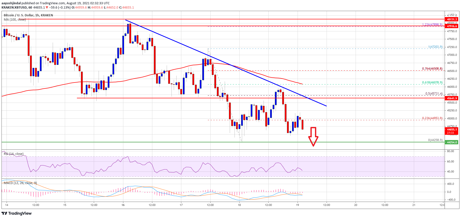 If bitcoin fails to climb above the $45,200 and $45,500 resistance levels, it could extend its decline. An initial support on the downside is near the $44,250 level.