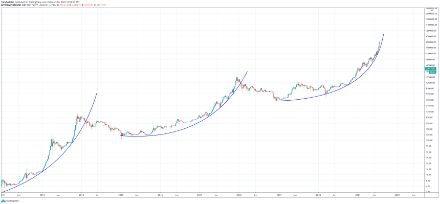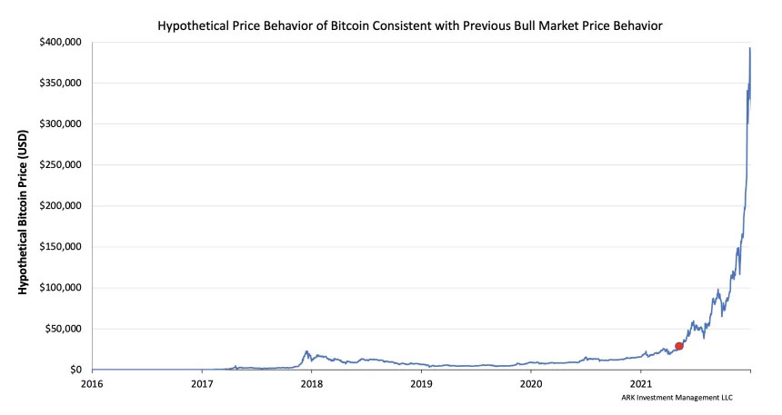 An analyst at Ark Invest has come up with a hypothetical chart that demonstrates what could come if a similar trajectory is followed. And according to the chart, the Bitcoin price would top out at roughly $390,000 at the height of the current cycle.