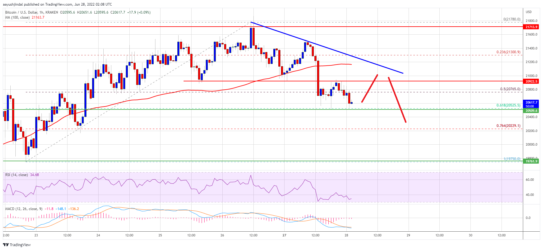 If bitcoin fails to clear the $21,250 resistance zone, it could continue to move down. An immediate support on the downside is near the $20,650 zone and $20,500.