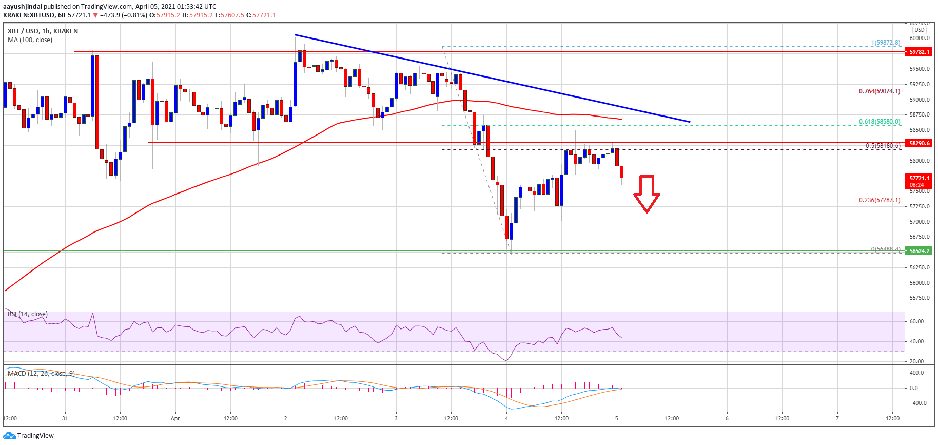 It is now trading well below $58,500 and the 100 hourly simple moving average. An immediate resistance is near the $58,180 level. It is near the 50% Fib retracement level of the recent drop from the $59,872 high to $56,488 low.