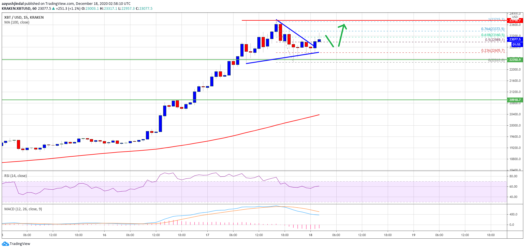 The price traded to a new all-time high at $23,715 before it started a downside correction. There was a break below the $23,000 and $22,800 levels. However, the bulls were able to protect the price from diving below $22,000.