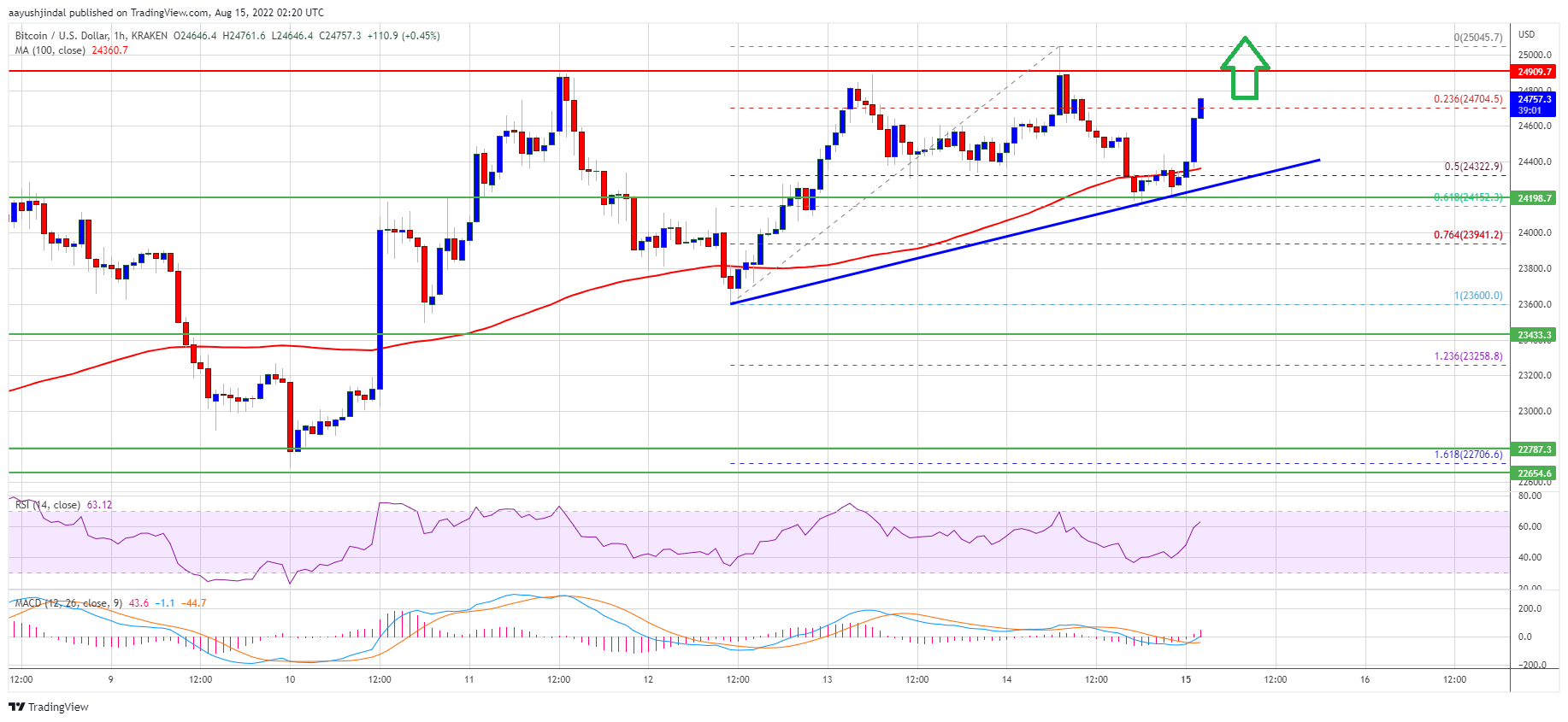 Bitcoin is gaining bullish momentum above $24,500 against the US Dollar. BTC could gain bullish momentum if it clears the $25,000 resistance zone.