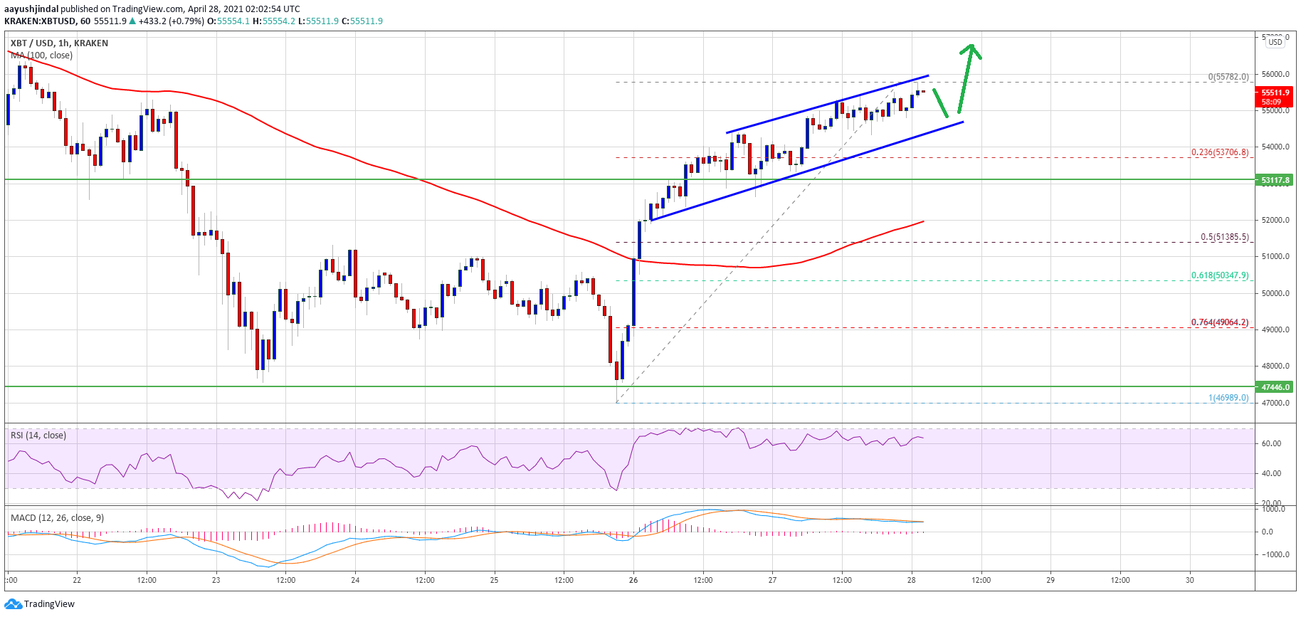 There was also a push above the $55,500 level and the price traded as high as $55,782. It is now consolidating gains well above the $55,000 level. There seems to be a short-term rising channel forming with resistance near $55,850 on the hourly chart of the BTC/USD pair.