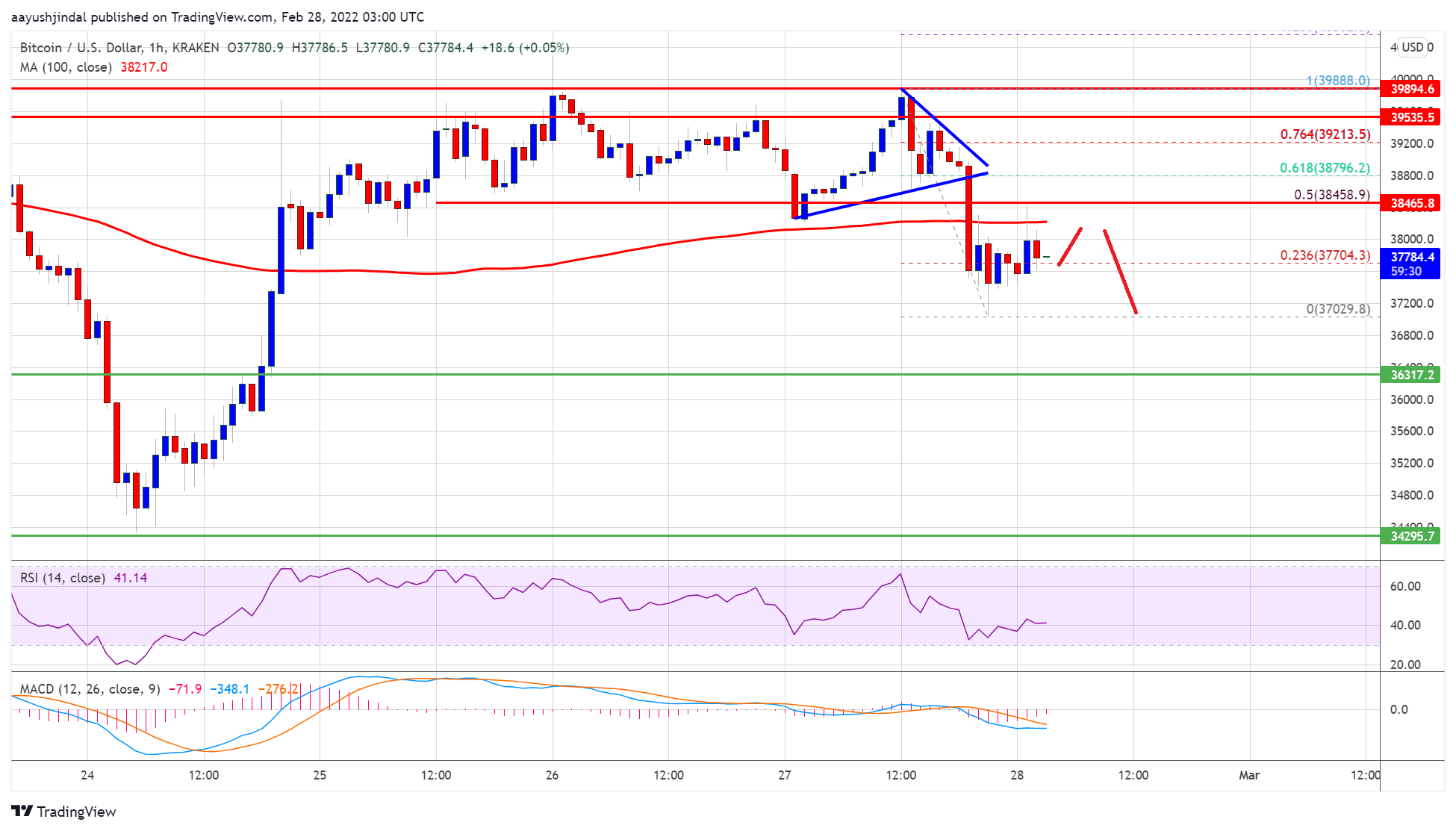 The pair is now trading below $39,000 and the 100 hourly simple moving average. A low is formed near $37,028 and the price is consolidating losses.