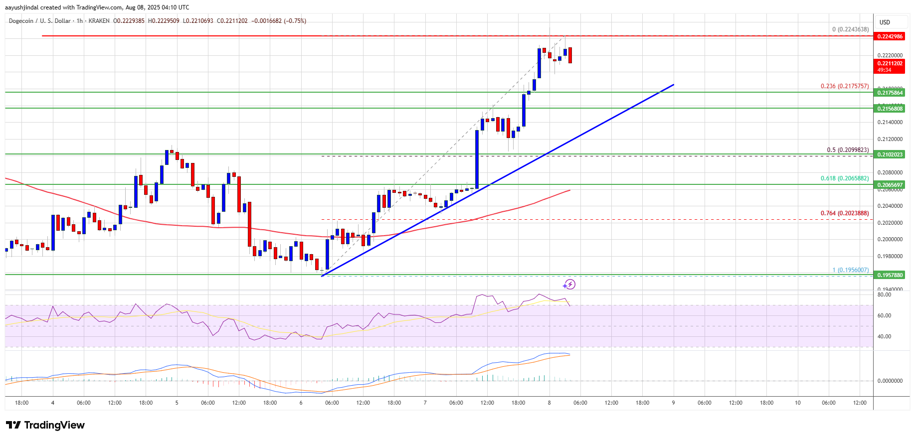 If DOGE’s price fails to climb above the $0.2250 level, it could start a fresh decline. Initial support on the downside is near the $0.2175 level. The next major support is near the $0.2150 level.