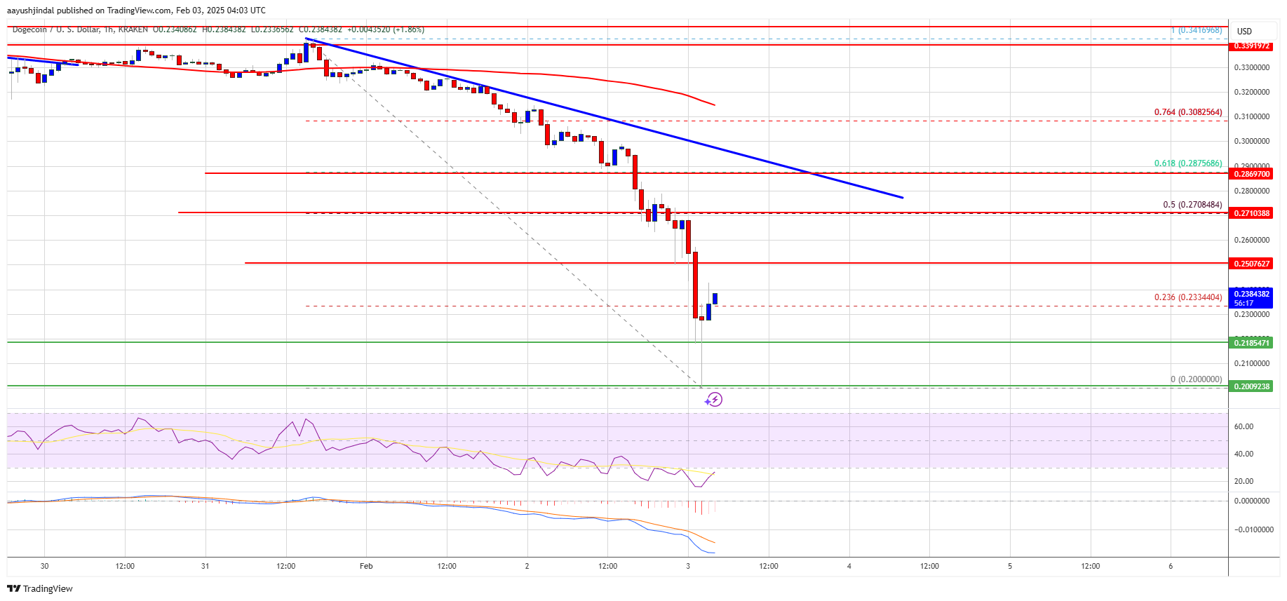 The price declined over 25% and tested the $0.20 zone. A low was formed at $0.20 and the price is now rising. There was a move above the 23.6% Fib retracement level of the downward move from the $0.3416 swing high to the $0.20 low.