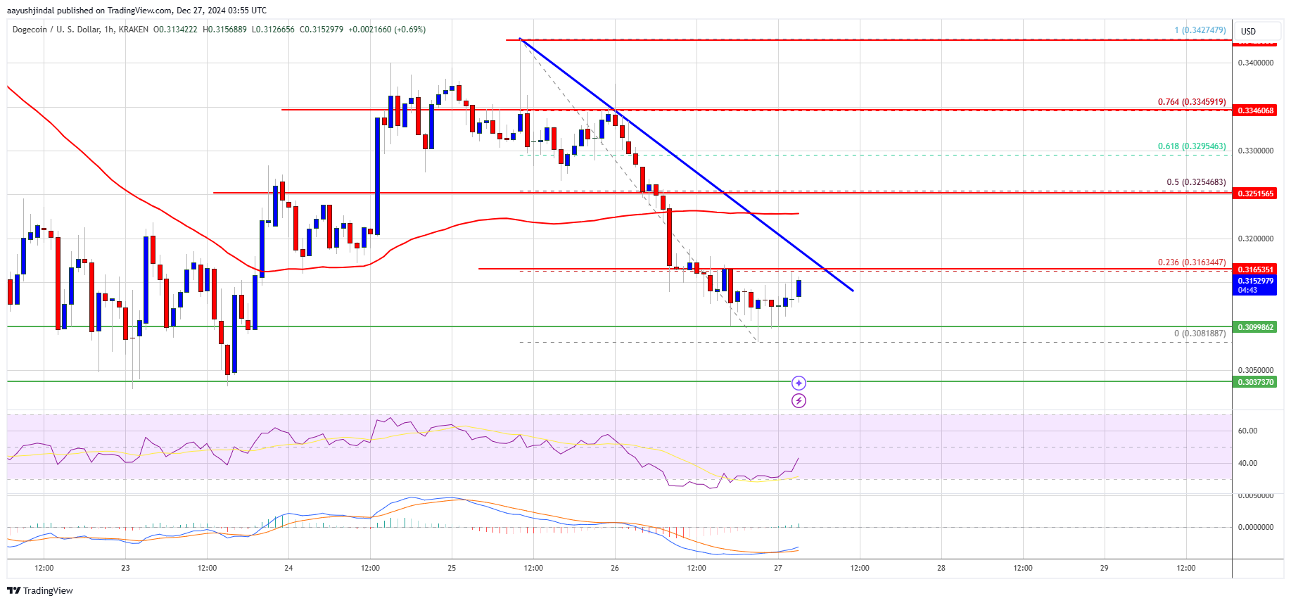 If DOGE’s price fails to climb above the $0.3165 level, it could start another decline. Initial support on the downside is near the $0.3120 level. The next major support is near the $0.3080 level.