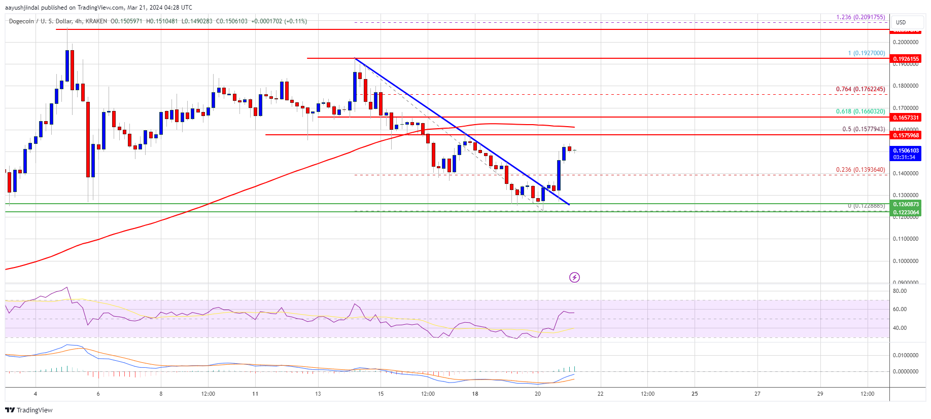 4 Hours RSI (Relative Strength Index) – The RSI for DOGE/USD is now above the 50 level.