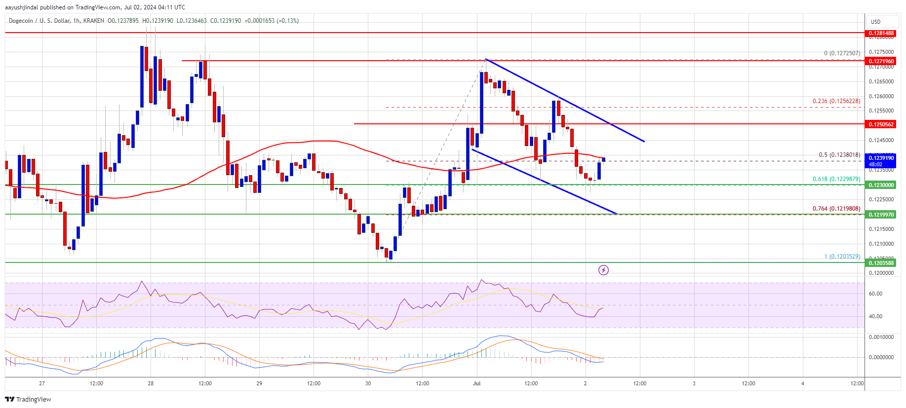 If DOGE’s price fails to gain pace above the $0.1250 level, it could continue to move down. Initial support on the downside is near the $0.1230 level.