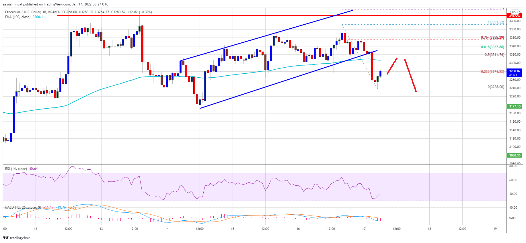 If ethereum fails to start a fresh increase above the $3,300 level, it could continue to move down. An initial support on the downside is near the $3,250 level.