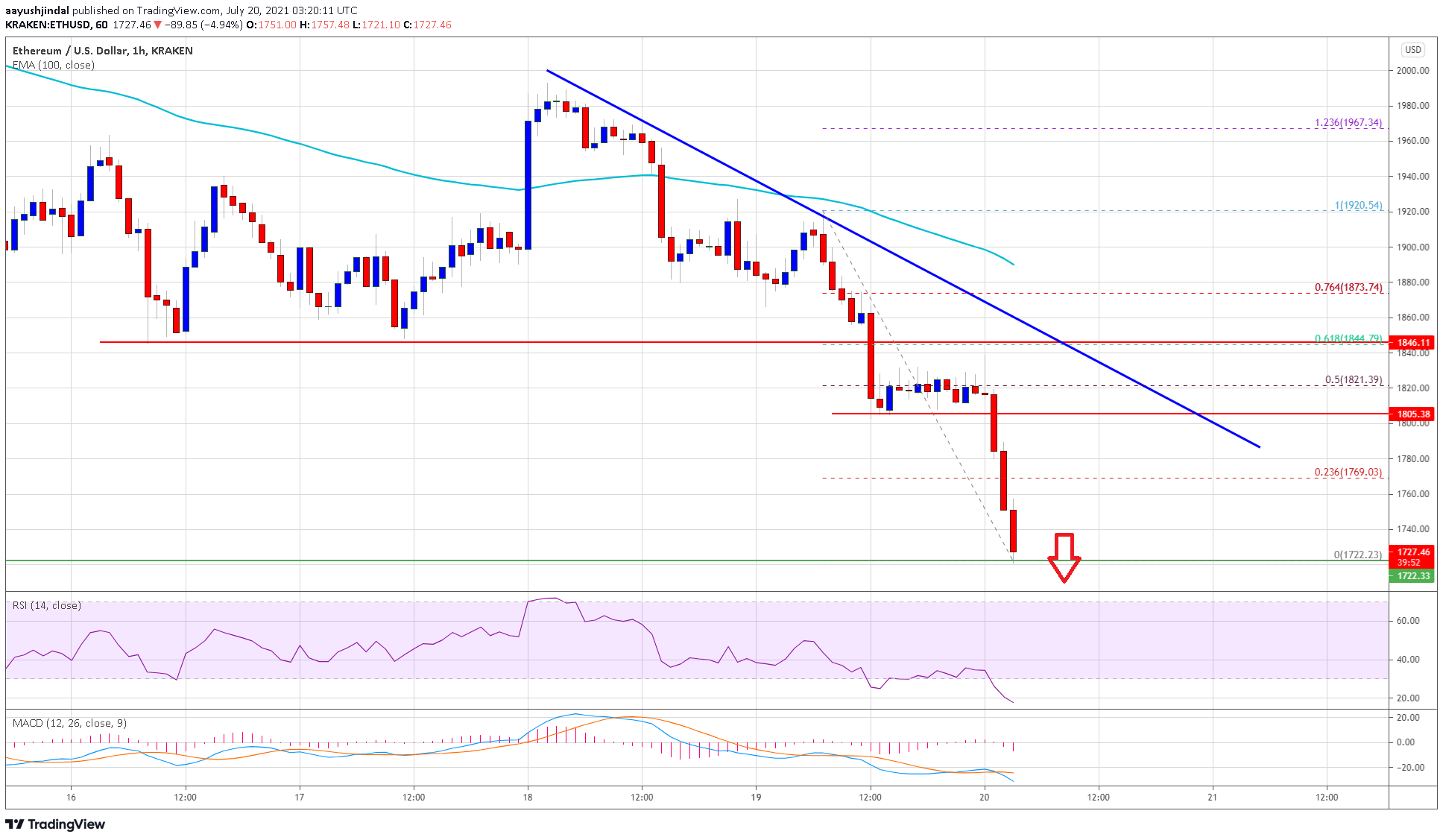 The price even declined below the $1,850 support and $1,800. A low is formed near $1,722 and the price is now showing signs of more losses in the near term. On the upside, an initial resistance is near the $1,770 level.