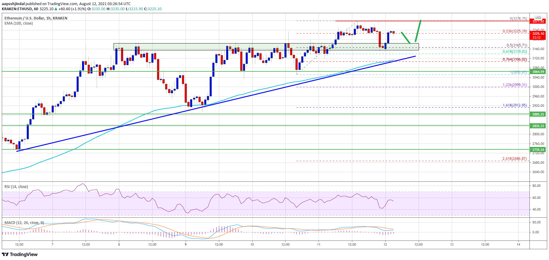 - The price is now trading above $3,200 and the 100 hourly simple moving average.