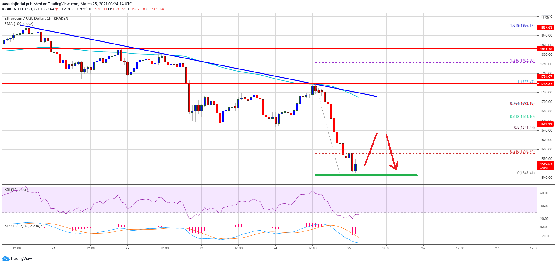 Ethereum is down over 5% and it broke the $1,600 support zone against the US Dollar. ETH price must stay above $1,550 to avoid more losses in the coming sessions.
