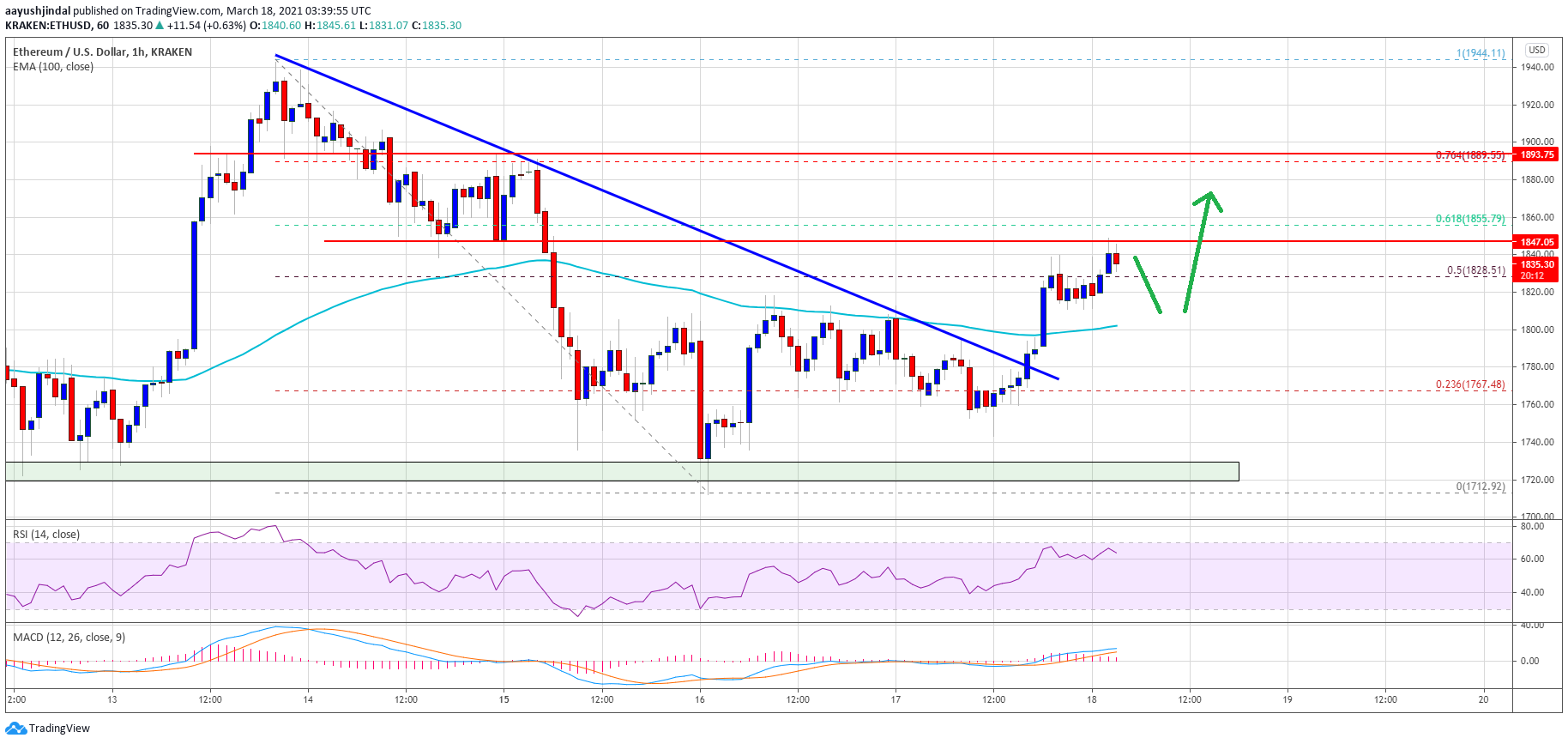 The bulls took control, resulting in a steady increase above the $1,800 resistance. It is now well above the $1,800 zone and the 100 hourly simple moving average. There was also a break above a major bearish trend line with resistance near $1,780 on the hourly chart of ETH/USD.