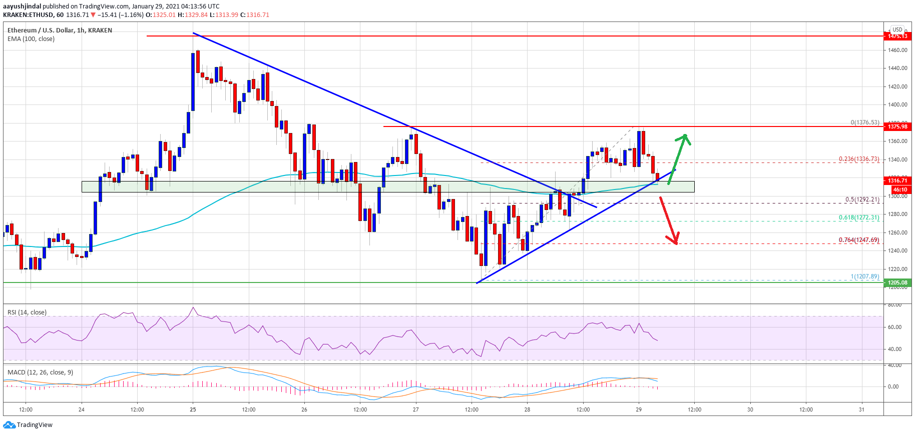 - There is a key bullish trend line forming with support near $1,305 on the hourly chart of ETH/USD (data feed via Kraken).