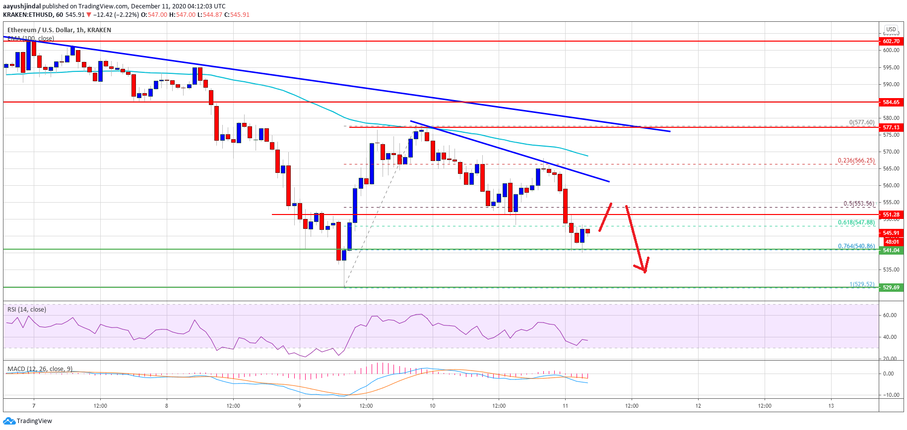 - There are two key bearish trend lines forming with resistance near $560 and $575 on the hourly chart of ETH/USD (data feed via Kraken).