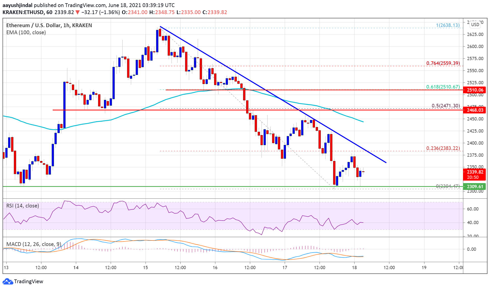 - There is a crucial bearish trend line forming with resistance near $2,380 on the hourly chart of ETH/USD (data feed via Kraken).