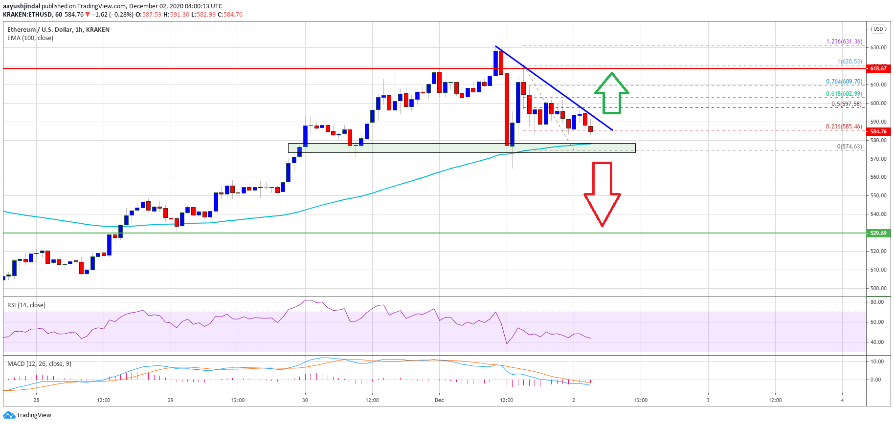 - There is a key bearish trend line forming with resistance near $590 on the hourly chart of ETH/USD (data feed via Kraken).