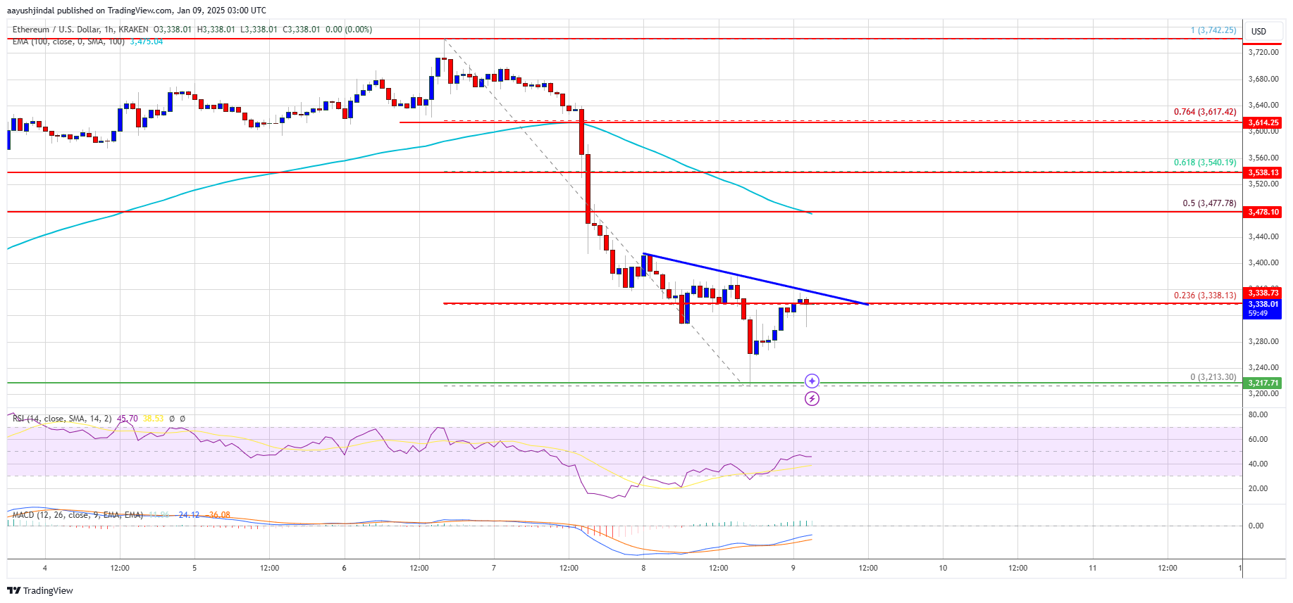 There was a clear move below $3,350 and $3,320. A low was formed at $3,213 and the price is now consolidating below the 23.6% Fib retracement level of the recent decline from the $3,743 swing high to the $3,213 low. There is also a connecting bearish trend line forming with resistance at $3,340 on the hourly chart of ETH/USD.