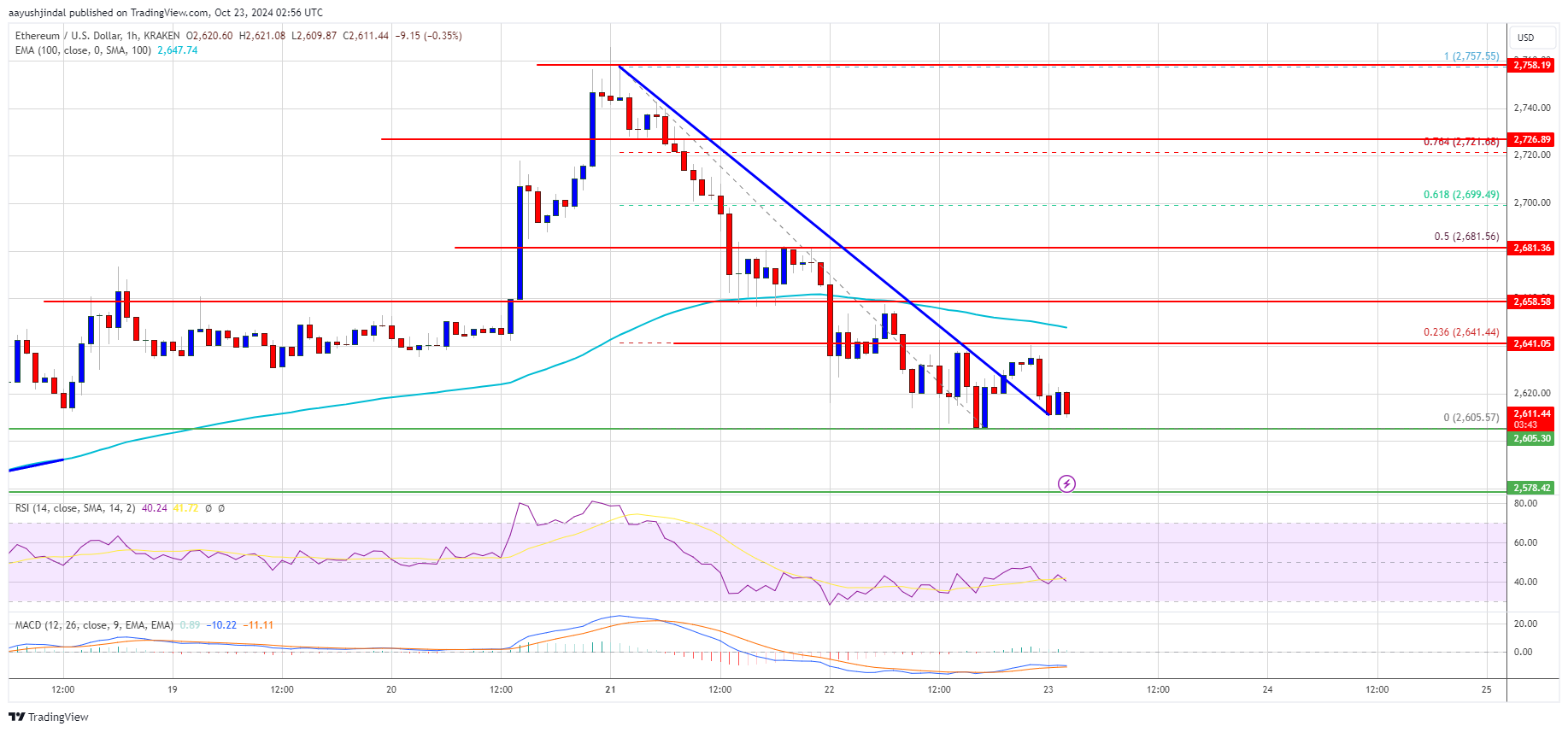 Ethereum price is now trading below $2,650 and the 100-hourly Simple Moving Average. On the upside, the price seems to be facing hurdles near the $2,650 level. The first major resistance is near the $2,700 level. It is close to the 50% Fib retracement level of the downward move from the $2,757 swing high to the $2,605 low.