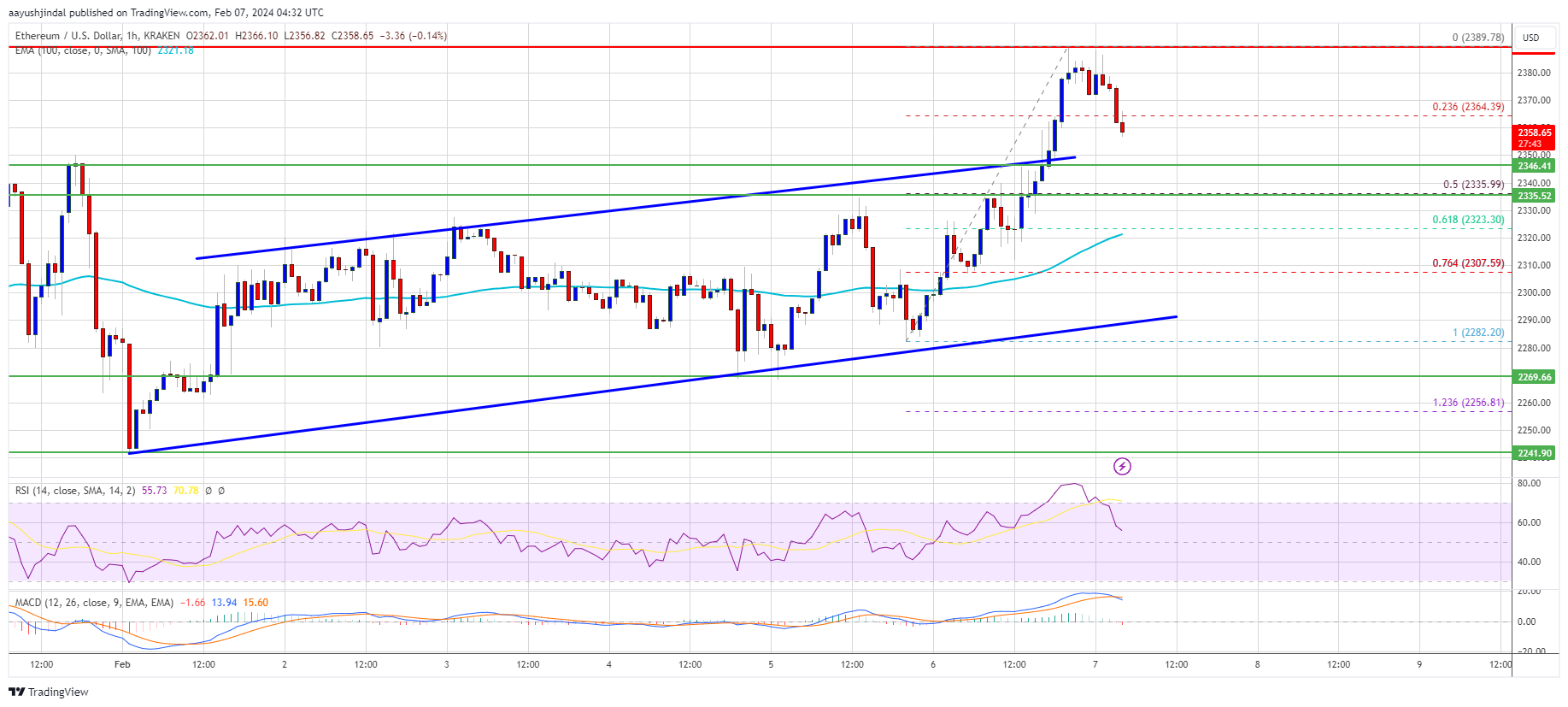 If Ethereum fails to clear the $2,380 resistance, it could start a downside correction. Initial support on the downside is near the $2,350 level and the channel trend line.
