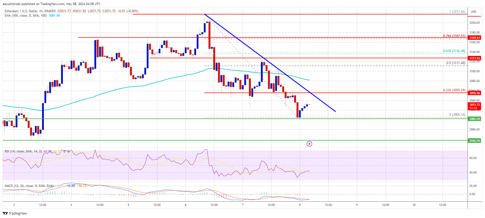 - The pair must stay above the $3,000 support to start another increase toward $3,220.