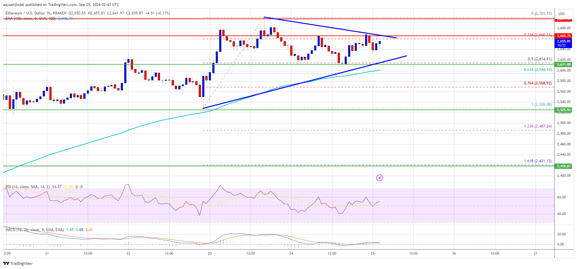 If Ethereum fails to clear the $2,680 resistance, it could start another decline. Initial support on the downside is near the $2,620 level and the triangle’s trend line. The first major support sits near the $2,600 zone.