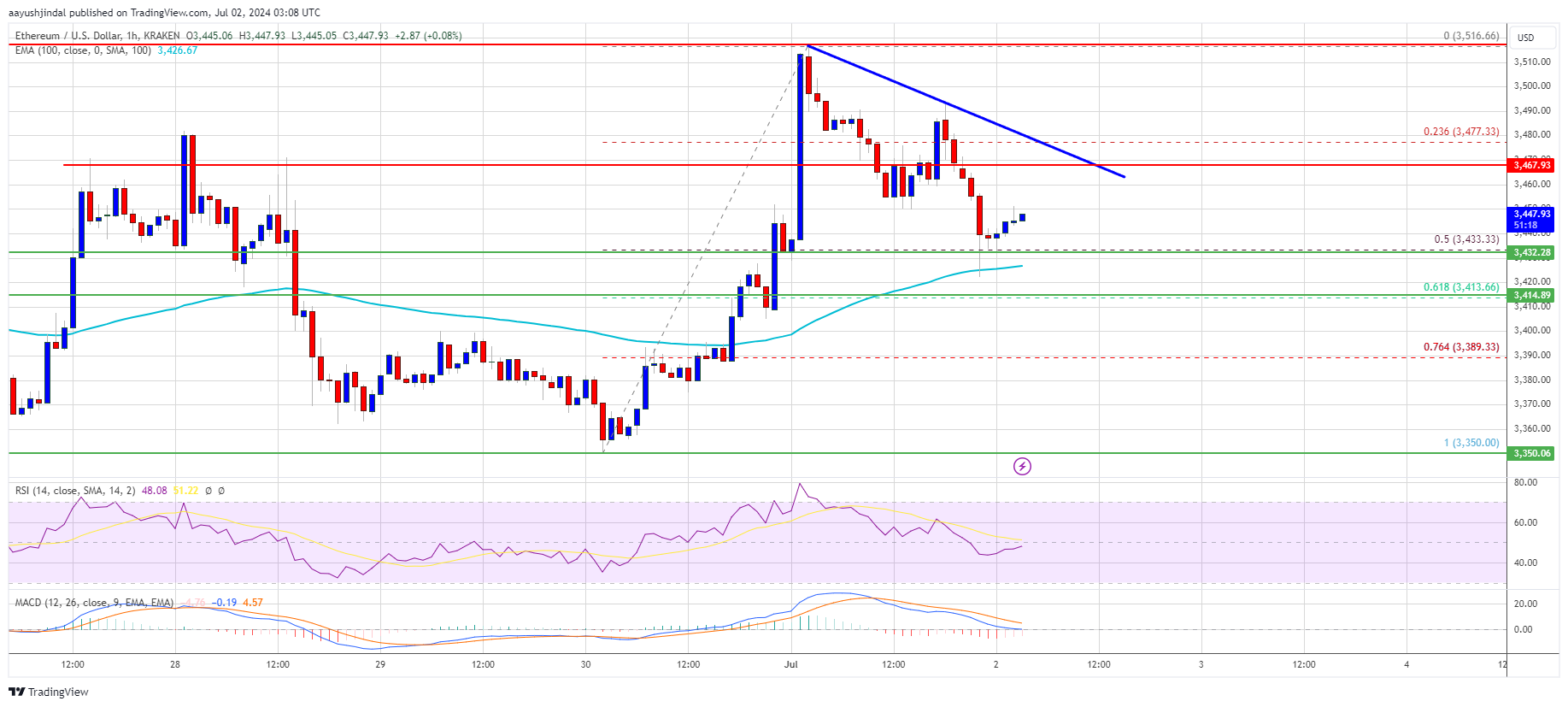 Ethereum price started a downside correction from the $3,520 zone. ETH is stable above $3,420 and might attempt another increase in the near term.
