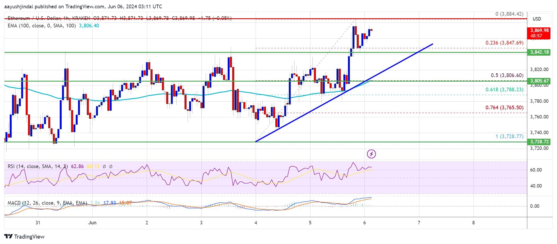 Ethereum is now trading above $3,800 and the 100-hourly Simple Moving Average. There is also a key bullish trend line forming with support near $3,840 on the hourly chart of ETH/USD.