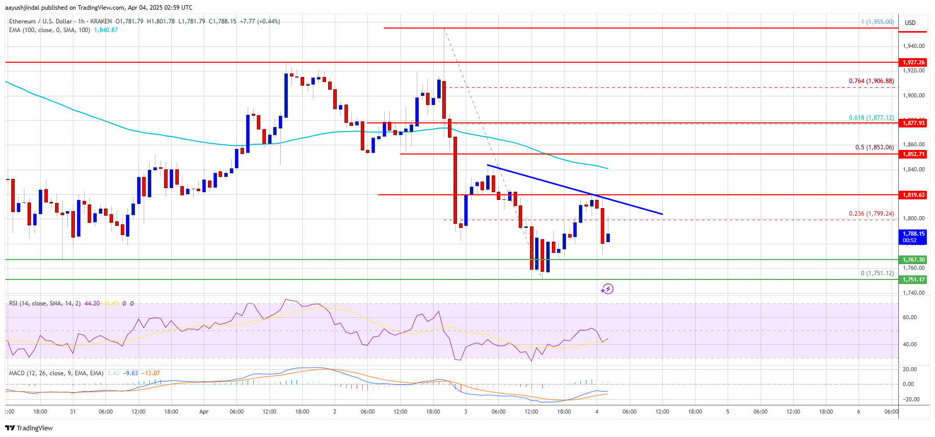 Ethereum price failed to stay above the $1,800 support zone and extended losses, like Bitcoin. ETH traded as low as $1,751 and recently corrected some gains. There was a move above the $1,780 and $1,800 resistance levels.