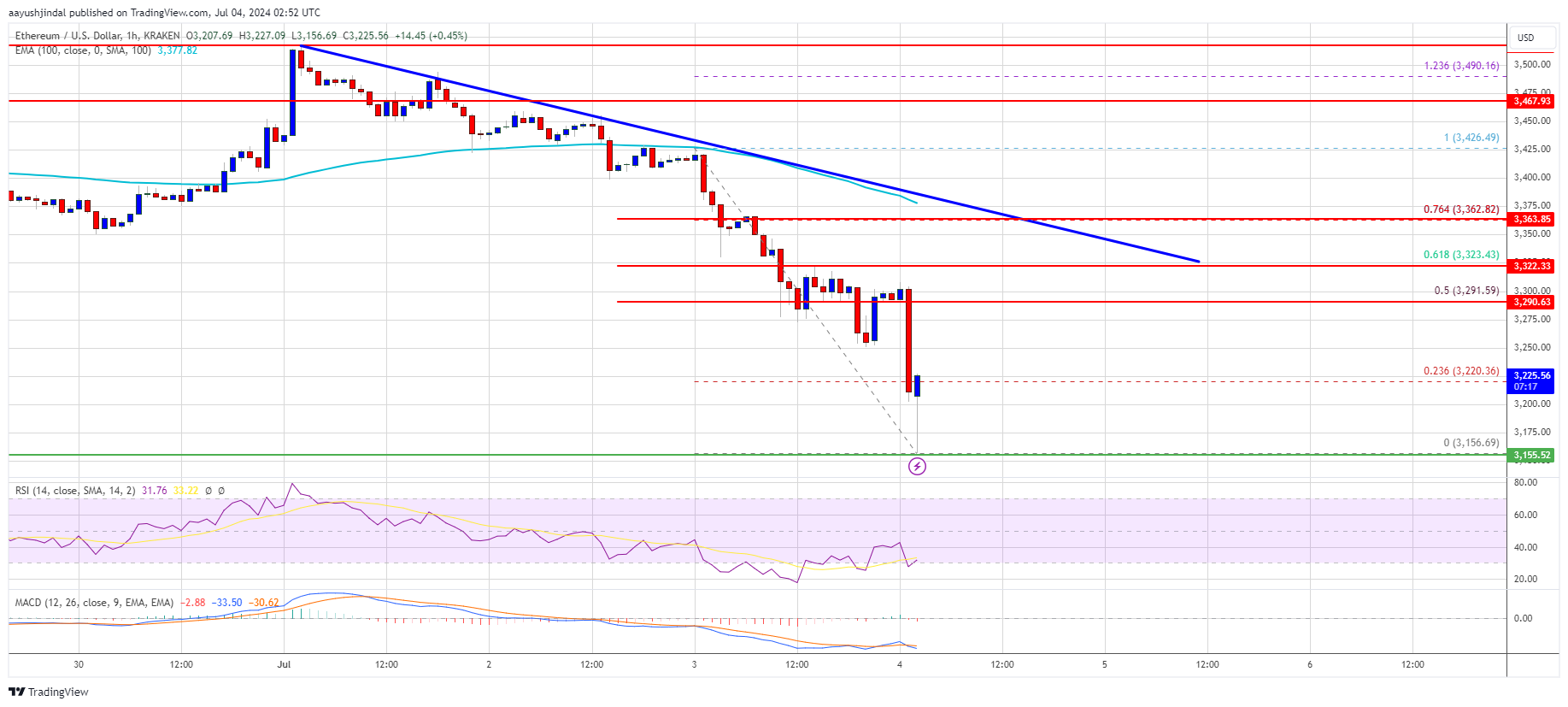 Ethereum price failed to clear the $3,520 zone and started a fresh decline. ETH dived below the $3,250 support and even tested the $3,150 zone.