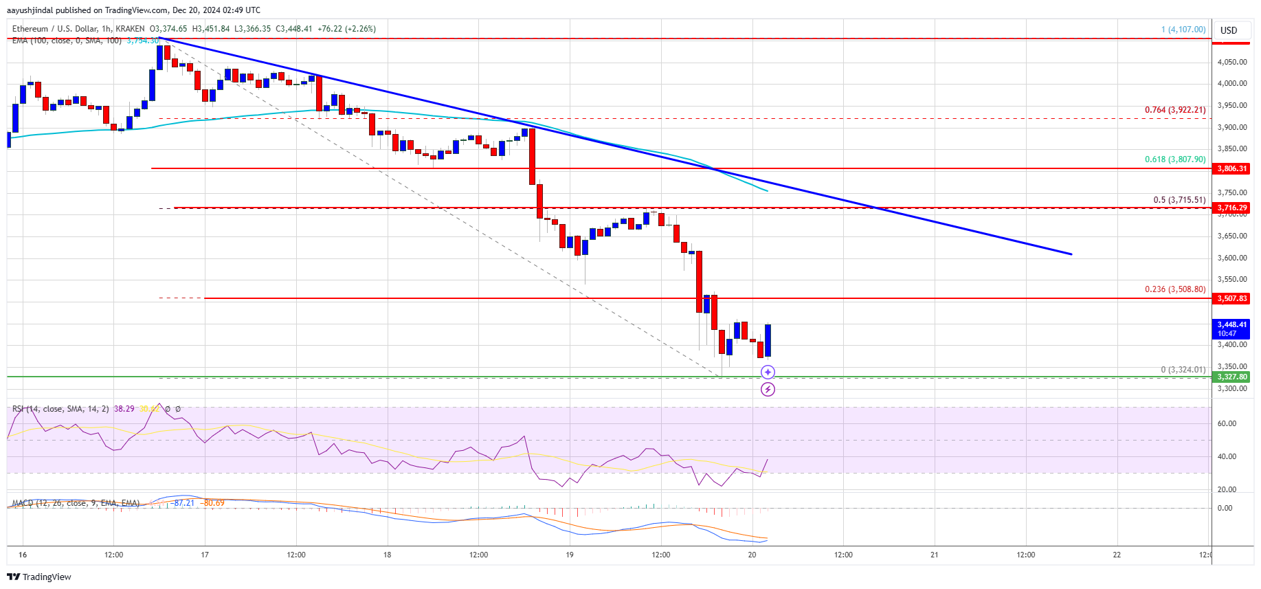 It even dived below $3,550 and spiked below the $3,420 level. A low was formed at $3,324 and the price is now consolidating losses. There is also a key bearish trend line forming with resistance at $3,650 on the hourly chart of ETH/USD.
