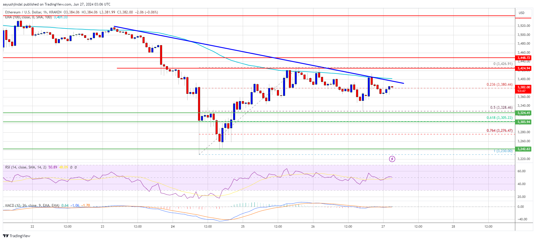 Ethereum is still trading below $3,400 and the 100-hourly Simple Moving Average. On the upside, the price is facing hurdles near the trend line and $3,400. There is also a connecting bearish trend line forming with resistance near $3,400 on the hourly chart of ETH/USD.