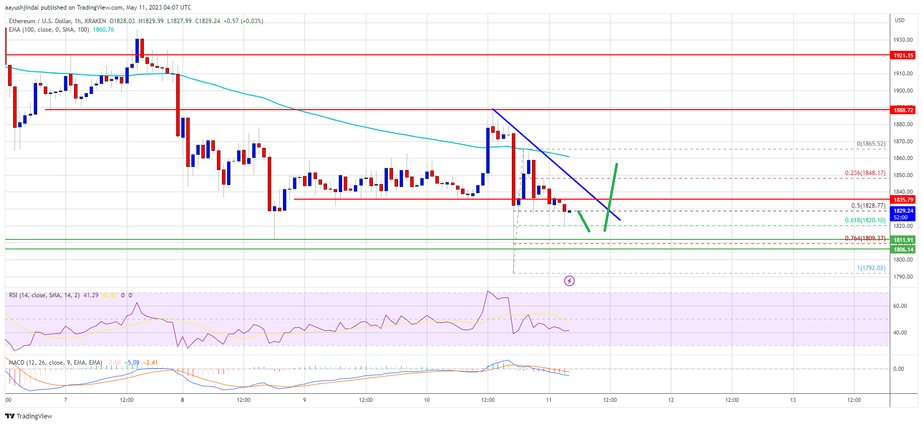 Ether is now trading below $1,850 and the 100-hourly Simple Moving Average. There is also a key bearish trend line forming with resistance near $1,840 on the hourly chart of ETH/USD.
