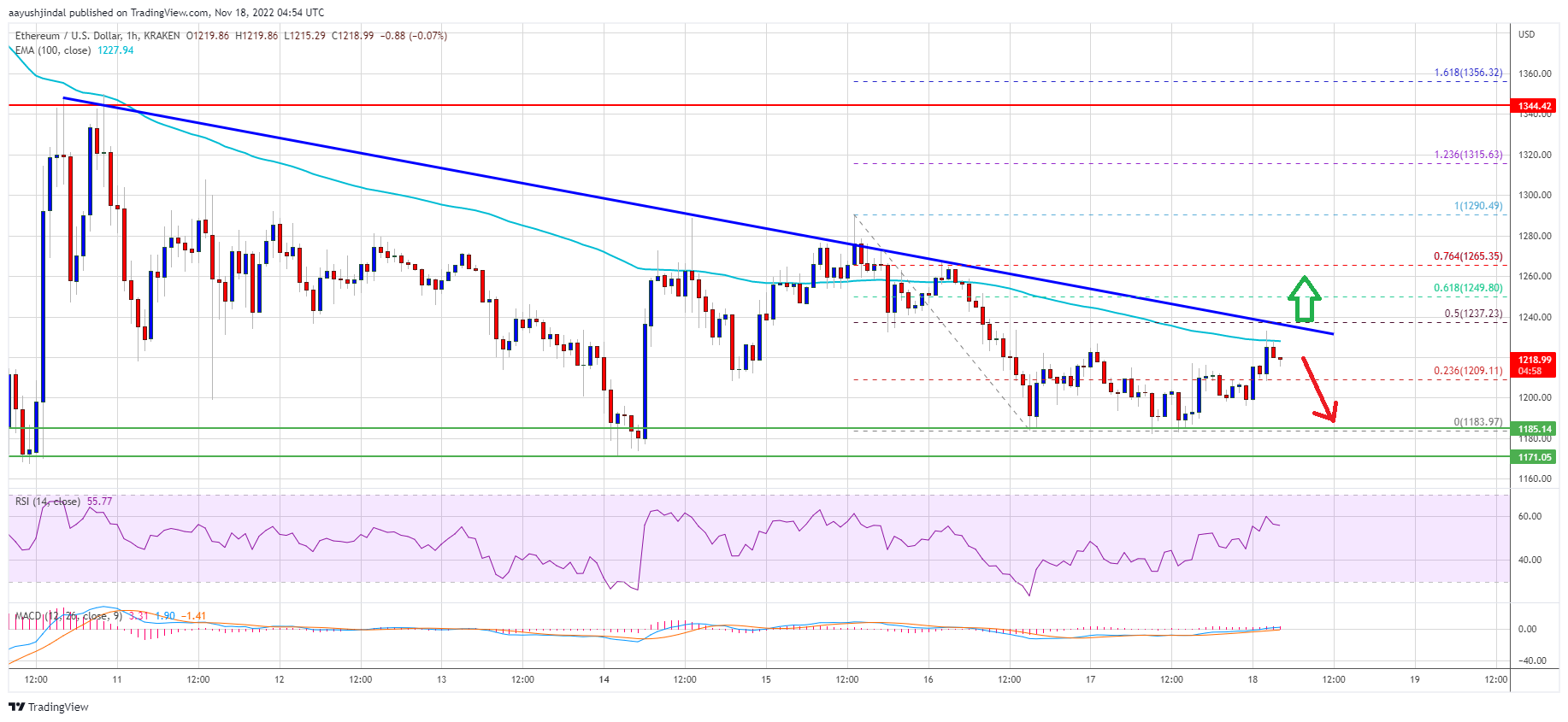 A high was formed near $1,290 before the price started a fresh decline. There was a clear move below the $1,260 and $1,250 levels. Ether price even traded below the $1,220 level. A low is formed near $1,183 and the price is now consolidating losses.
