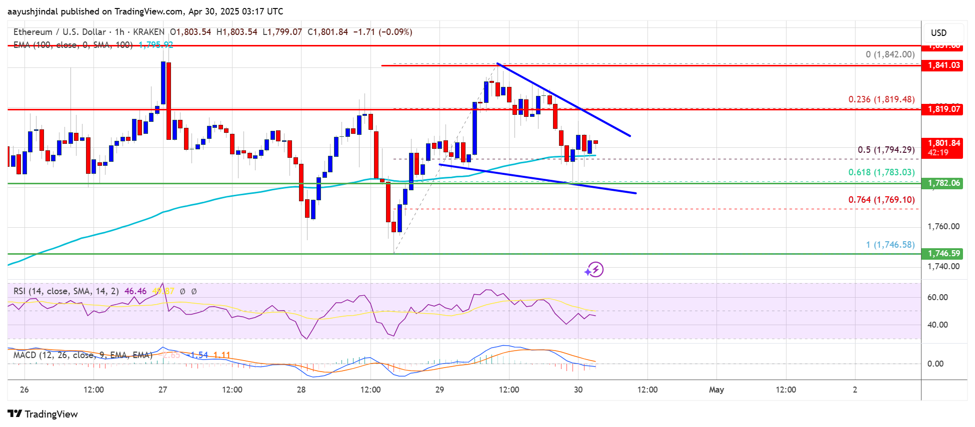 Ethereum price started a downside correction from the $1,850 level. ETH is now consolidating near the $1,800 zone and might aim for a move above $1,820.