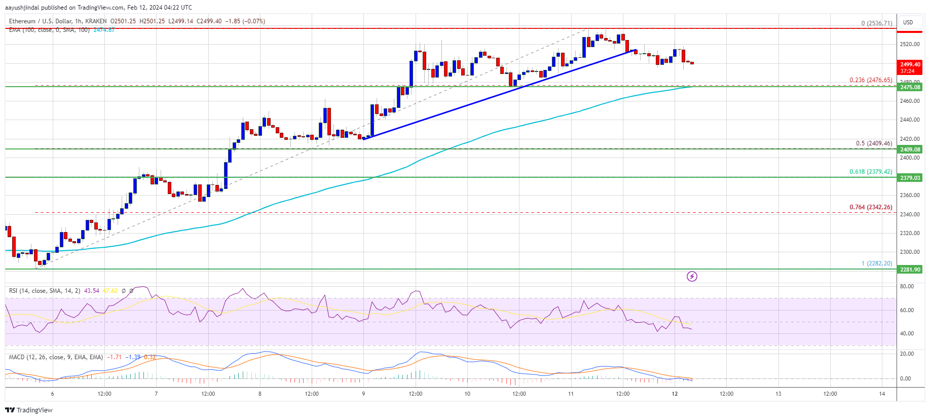 A high was formed near $2,536 and the price is now consolidating gains. There was a minor decline below the $2,500 level. There was also a break below a connecting bullish trend line with support at $2,515 on the hourly chart of ETH/USD.