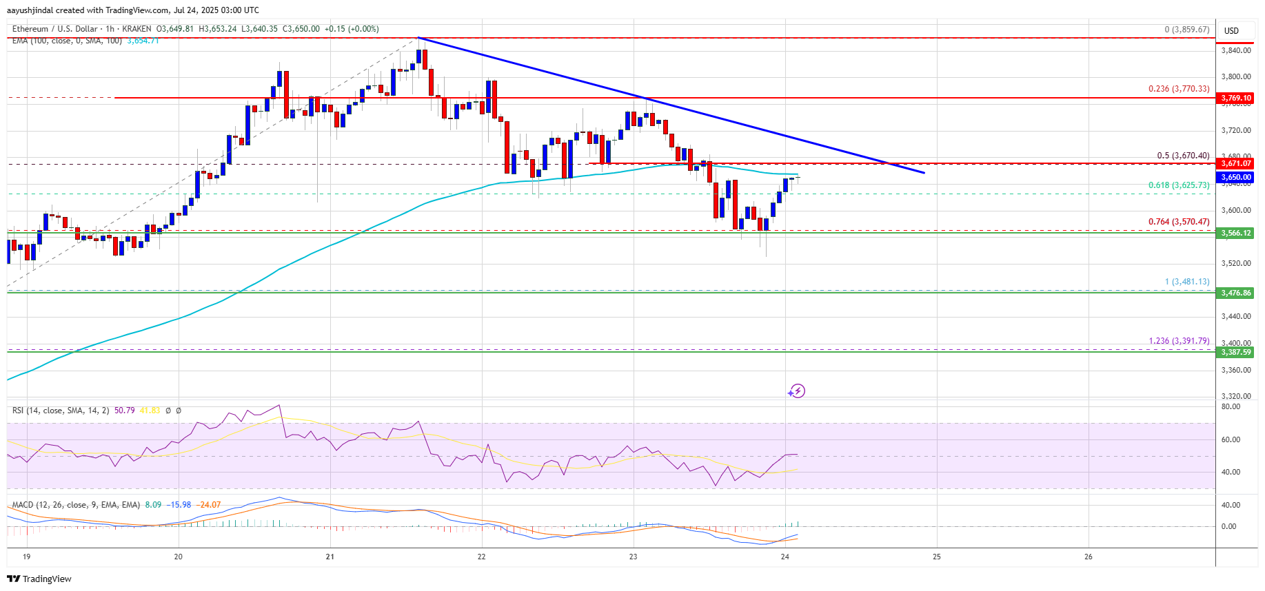 If Ethereum fails to clear the $3,670 resistance, it could start a downside correction. Initial support on the downside is near the $3,600 level. The first major support sits near the $3,570 zone.