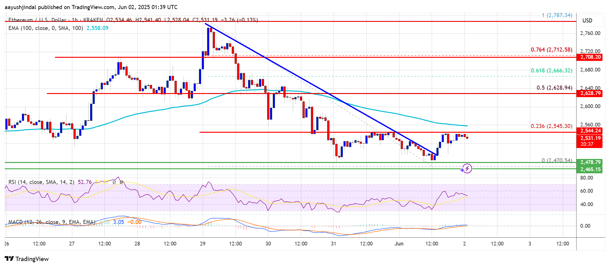 The price even declined below the $2,550 level. A low was formed at $2,470 and the price is now consolidating losses. There was a move above the $2,500 level. Besides, there was a break above a key bearish trend line with resistance at $2,500 on the hourly chart of ETH/USD.
