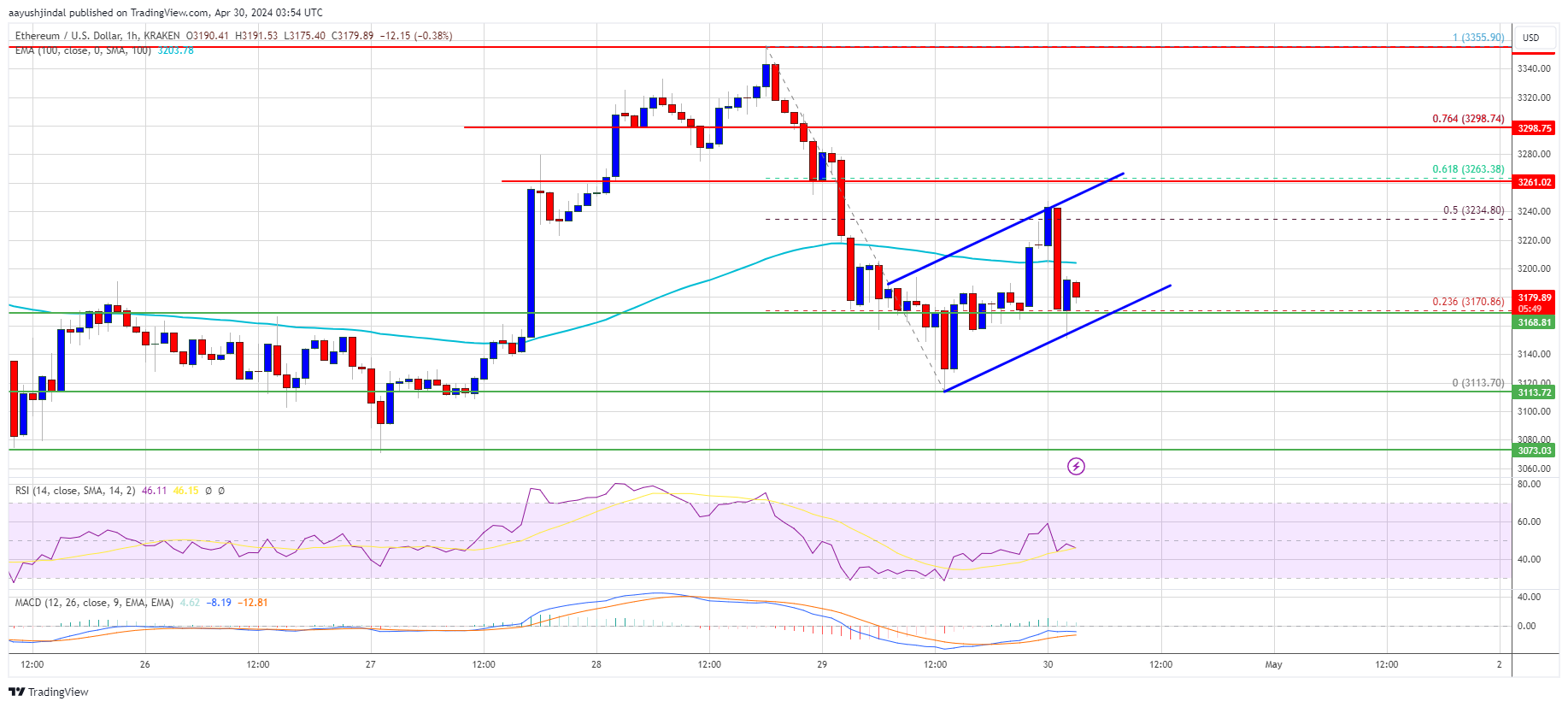 Ethereum price failed to settle above the $3,250 level and started another decline, like Bitcoin. ETH traded below the $3,200 level and even spiked below $3,120. A low was formed at $3,113 and the price is now consolidating.